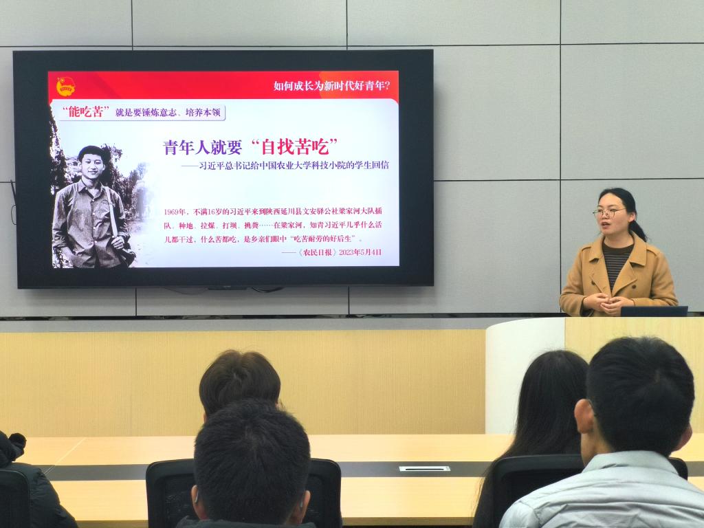 学院团委书记郭婷婷以《挺膺担当砺青春 强国有我建新功》为题,阐述了青年是强国复兴的重要力量,中国式现代化建设是青年逐梦的大舞台,号召青年学子以“有理想、敢担当、能吃苦、肯奋斗” 为指引,坚定信念、锤炼本领、勇于奉献,在火热实践中绽放青春光彩。