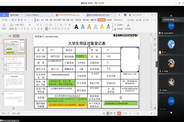 会议伊始,段鹿杰从学生较为关心的方面就征兵相关优惠政策进行了解读,与大家算了政治、经济、前途、阅历、人脉五笔账。随后,张钰扬以共享屏幕的方式对《2020年征兵工作安排》、《大学生预征对象登记表》中注意事项进行了详细的阐述。最后,有参军意向的同学提出疑问,老师进行答疑解惑。
