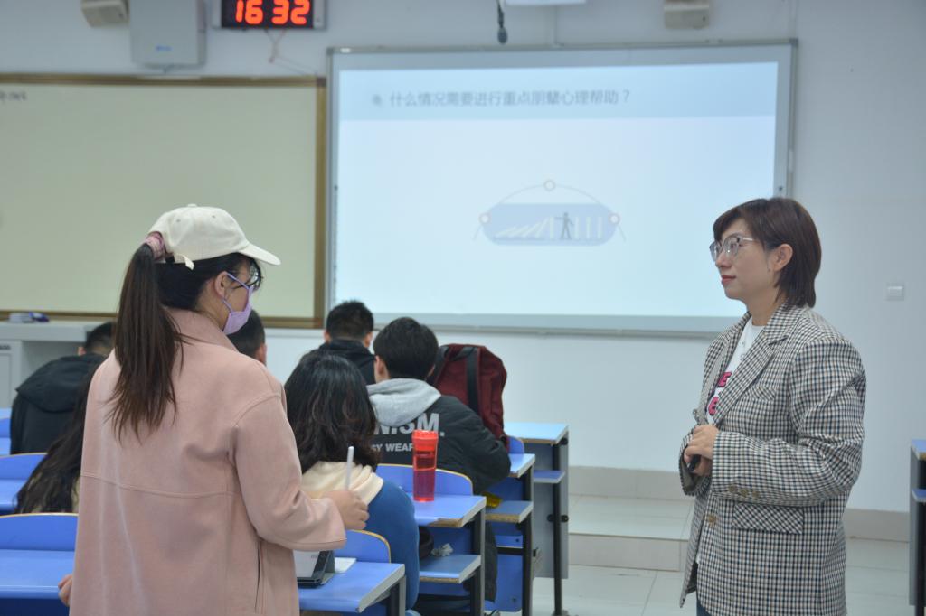 本次讲座主要由心理委员的角色价值、心理委员的工作职责、重点朋辈心理帮助工作三部分组成。讲座始伊,乔杨指出,作为班级心理干部,要“有爱心、有耐心、有诚心、有责任心”,要主动组织并参与班级心理健康活动。乔杨就学院心理干部的工作制度对心理干部如何履行职责展开阐述,结合实际生活案例和视频生动地对重点朋辈帮助技巧进行解释,现场互动积极,反响极佳。她强调,“学校—学院—班级—宿舍”四级心理健康网络体系的建设,为同学们在遇到心理危机时能得到有效的心理帮助提供了可能。