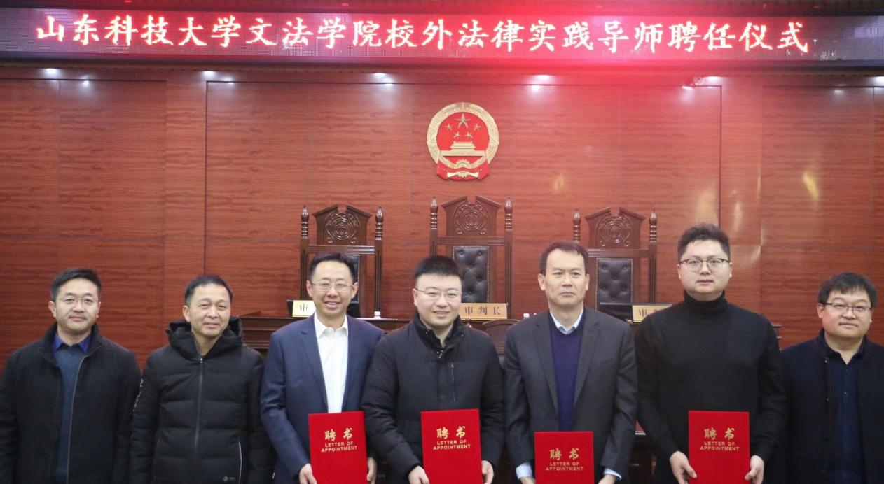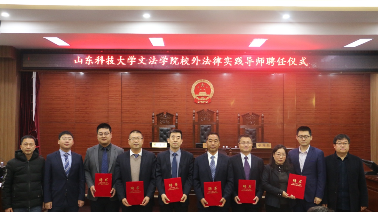 比赛结束后,举行了校外法律实践导师聘任仪式,山东理证律师事务所律师刘占先、徐效国、李增福、张蕾、徐公国、牛浩学、王涛,北京市兰台(青岛)律师事务所律师刘晨、王正起、吴刚、杜春华等11位被聘为我校首批校外法律实践导师。