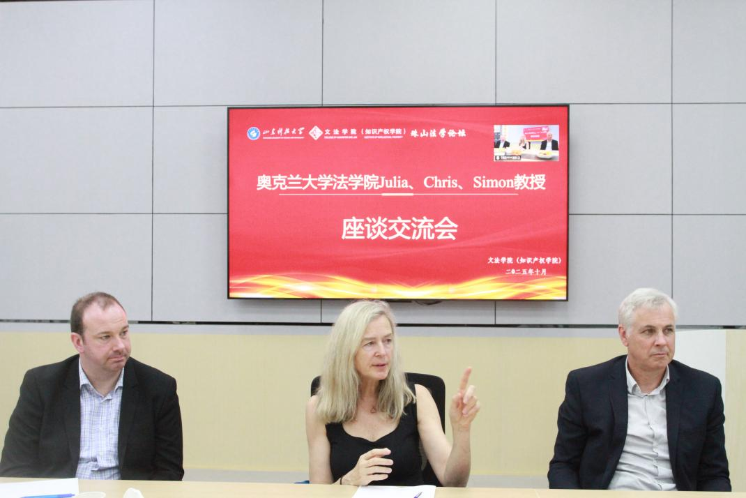 2025年10月17日下午,我院主办的新西兰奥克兰大学法学院教授座谈交流会在图书馆2楼文法分馆举行。本次座谈会采用线上线下相结合的形式,由600cc全讯白菜网副院长秘明杰主持,奥克兰大学法学院Chris、Julia、Simon三位教授应邀参会,600cc全讯白菜网院长孙法柏教授、赵丽莉教授、李宗录教授、韩天竹副教授、吴立志副教授、张禹博士等法学系教师以及部分本科生、研究生代表共同参与,围绕法律前沿议题深度对话。