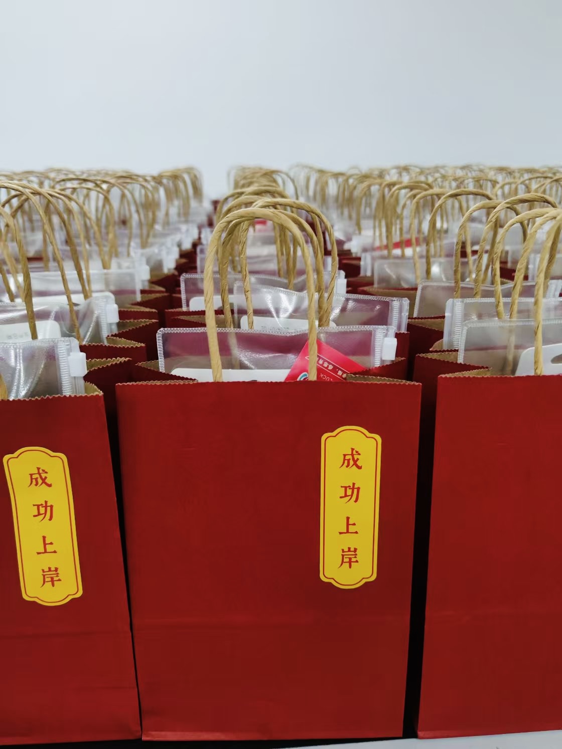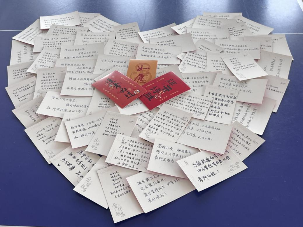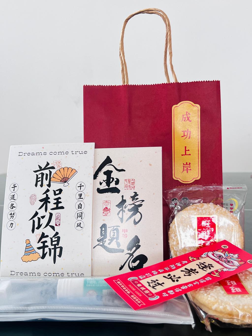 福袋包装上印有“成功上岸”的字样,希望每位考生都能在这场人生的考验中顺利过关。福袋内容丰富,文具套装包含了考试所需要的各种文具,黑色签字笔、2B铅笔、橡皮、小刀、胶棒等等,一应俱全,为考生们提供便利,让大家在考试中心无旁骛发挥出自己的最佳水平,取得优异成绩。此外,福袋中还含有辅导员老师特别定制的手写加油卡片,每一张卡片上都载满了对考研学子的殷切期望,字里行间中透露出深深的师生情谊。